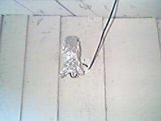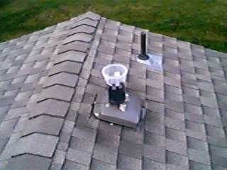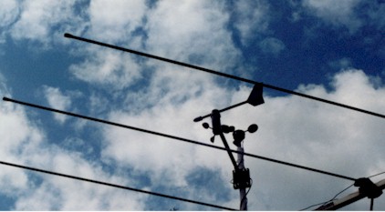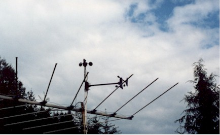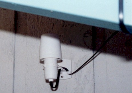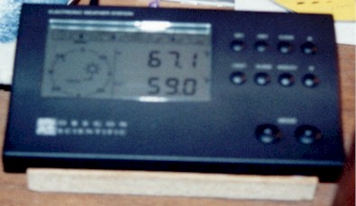 My weather station is an Oregon Scientific WM-918 Weather Station. It was setup on March 28, 1999 and has worked great since! I have had a few sporadic readings with the wind speed and rate of rainfall, which occurs when lightning is really close. Rarely I'll get a crazy reading with the low temp. Other than that, I highly recommend this weather station to anyone where money is a factor. For more information and links regarding the weather station, visit my other website: WM-918/WX200 Wx Station. Anemometer & Wind Vane The anemometer and wind vane are mounted on a 12 1/2 in. PVC pipe, which is mounted to a TV antenna. The other anemometer you see sticking straight up is a Nor'Easter anemometer by Maximum Instruments and is not part of the weather station. Rainguage The rainguage (which automatically empties) is attached to four small wood blocks, which are glued onto a vent located on the roof to keep the rainguage level. To the right, is a picture of the raingauge with a homemade extension, which gives more accurate and precise readings. With the extension, I get a precision of .02", verses the .04" precision without the extension. The extension is a plastic tupperware container with specific size requirements. For more information on the extension, visit my other website: WM-918/WX200 Wx Station. Temperature/Humidity/Dewpoint Sensor These are pictures of the Temperature/Humidity sensor. It is located on the NNW part of the house under the eave of the roof. The picture on the right is the temp/humidity sensor with foil on it. The foil is wrapped around the sensor with the bottom of the foil flared out. The foil helps to deflect radiated heat, which gives more accurate readings. I have had very good results with the foil on the temp/humidity sensor and get very accurate temperature readings when compared to various other local weather stations and sensors. Display Unit The display unit is attached to a wood block with Velcro adhesives and is then placed on a shelf. The wood block just raises the unit up a about an inch and helps to keep the display unit secure.